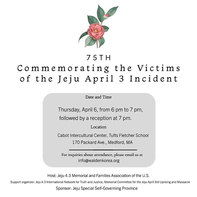 Support organizer: Jeju 4·3 International Network for Truth and Justice, Memorial Committee for the Jeju April 3rd Uprising and Massacre, Fletcher School North Korea Working Group