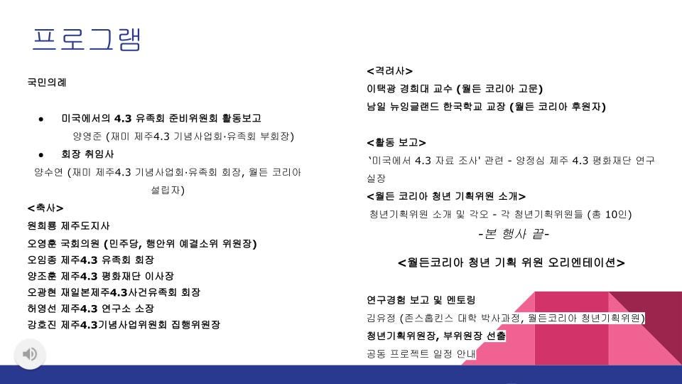 Due to the COVID-19 pandemic, the launch ceremony was held as a live Zoom event. In her inaugural address, Chairwoman Yang stated that although many families have lived abroad for a long time, the bereaved families in the United States will not forget the Jeju 4.3 Massacre.